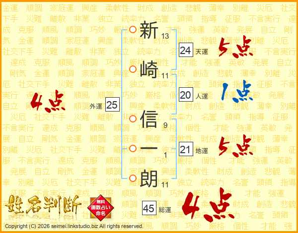 新(13画)崎(11画) 信(9画)一(1画)朗(11画)