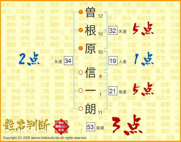 曽(12画)根(10画)原(10画) 信(9画)一(1画)朗(11画)