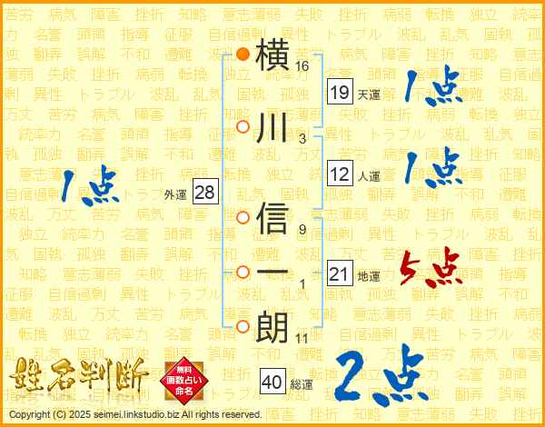 横(16画)川(3画) 信(9画)一(1画)朗(11画)