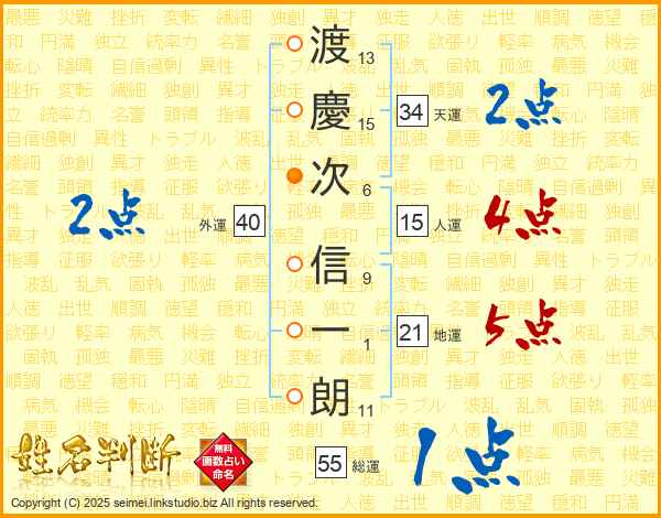 渡(13画)慶(15画)次(6画) 信(9画)一(1画)朗(11画)
