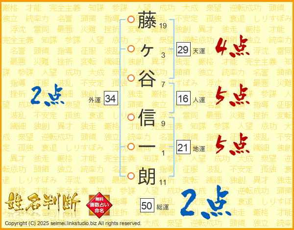 藤(19画)ヶ(3画)谷(7画) 信(9画)一(1画)朗(11画)