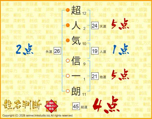 超人気信一朗さんの総運は45画の4点!