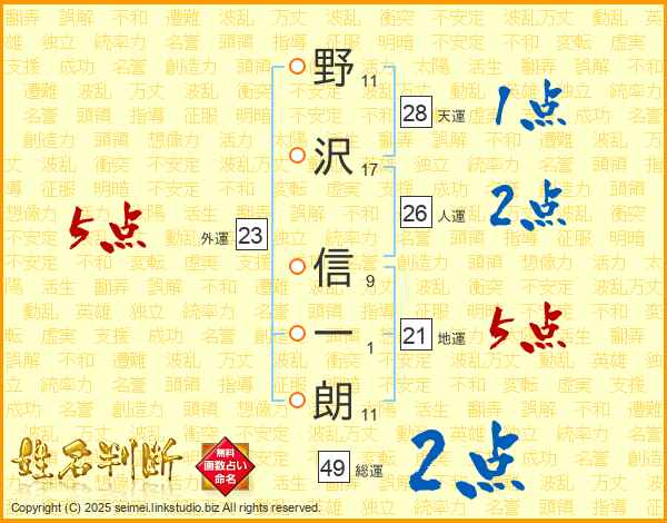 野(11画)沢(17画) 信(9画)一(1画)朗(11画)