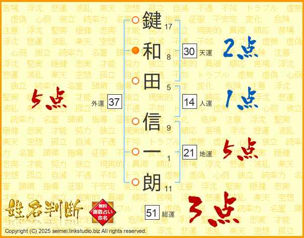 鍵(17画)和(8画)田(5画) 信(9画)一(1画)朗(11画)