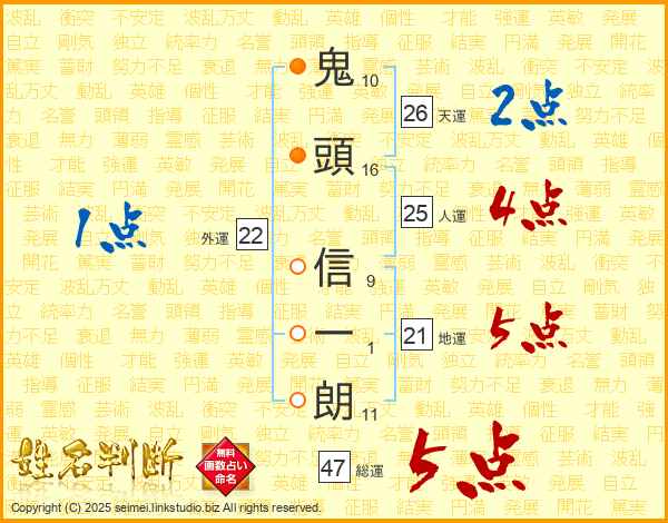 鬼(10画)頭(16画) 信(9画)一(1画)朗(11画)
