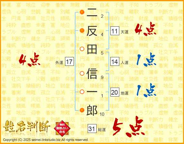 二(2画)反(4画)田(5画) 信(9画)一(1画)郎(10画)