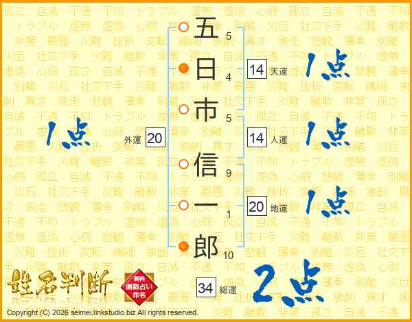 五(5画)日(4画)市(5画) 信(9画)一(1画)郎(10画)
