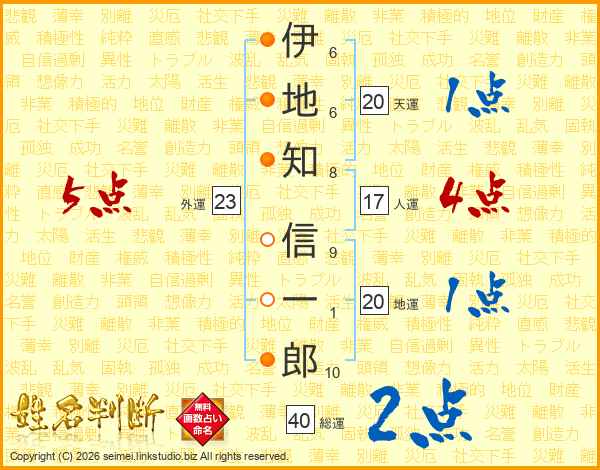 伊(6画)地(6画)知(8画) 信(9画)一(1画)郎(10画)