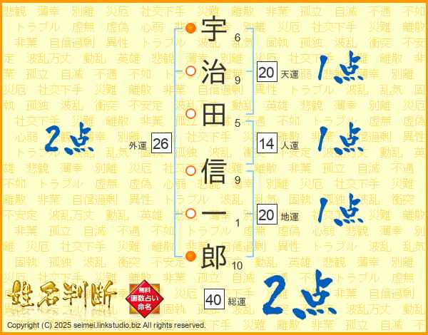 宇(6画)治(9画)田(5画) 信(9画)一(1画)郎(10画)