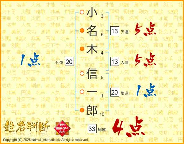 小(3画)名(6画)木(4画) 信(9画)一(1画)郎(10画)