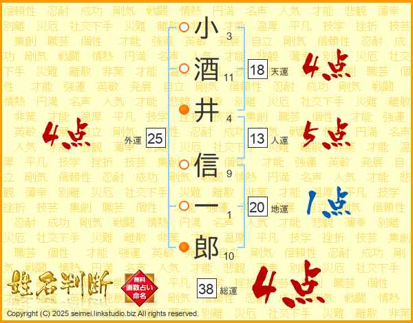 小(3画)酒(11画)井(4画) 信(9画)一(1画)郎(10画)