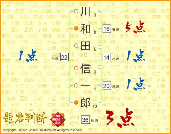 川(3画)和(8画)田(5画) 信(9画)一(1画)郎(10画)