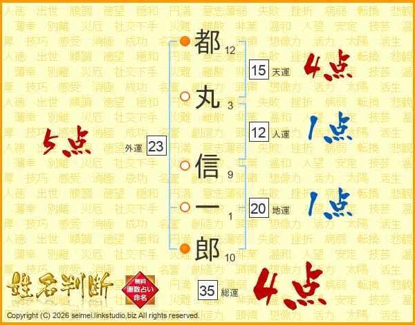 都(12画)丸(3画) 信(9画)一(1画)郎(10画)