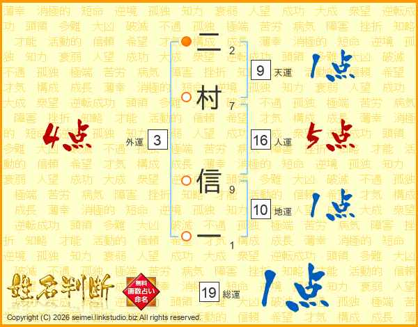 生活面を象徴する運勢です。外部から受ける影響力を表し、結婚運、家庭運や職場、環境への順応性を表します。総運から人運を引いた画数。姓や名が1文字の場合を除く。