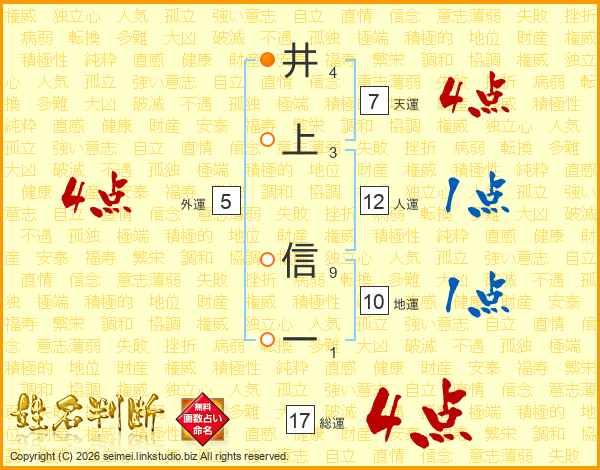生活面を象徴する運勢です。外部から受ける影響力を表し、結婚運、家庭運や職場、環境への順応性を表します。総運から人運を引いた画数。姓や名が1文字の場合を除く。