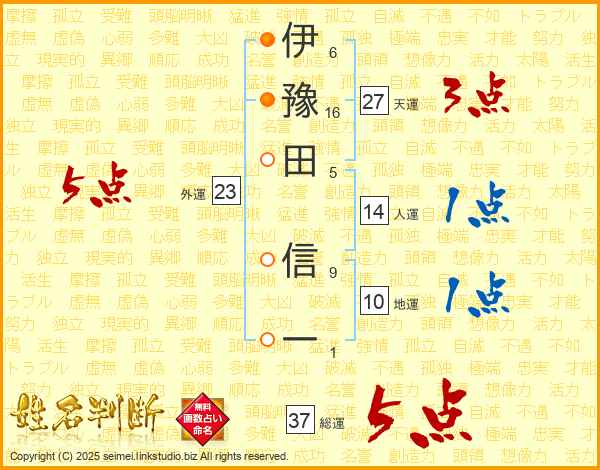 伊(6画)豫(16画)田(5画) 信(9画)一(1画)