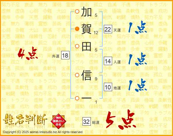 加(5画)賀(12画)田(5画) 信(9画)一(1画)
