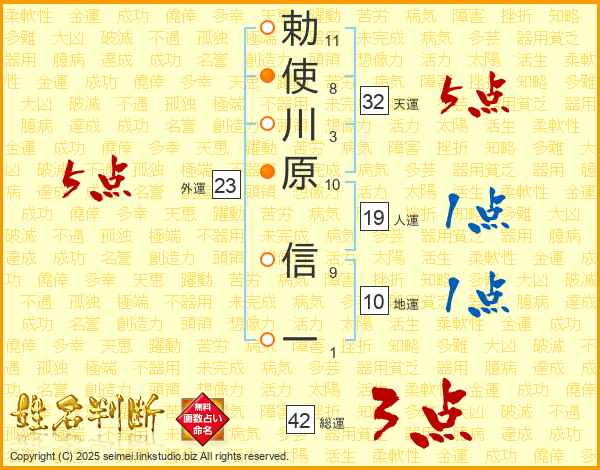 勅(11画)使(8画)川(3画)原(10画) 信(9画)一(1画)