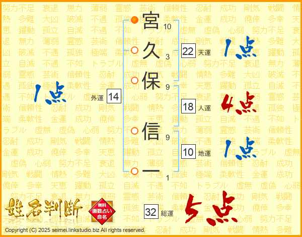 宮(10画)久(3画)保(9画) 信(9画)一(1画)