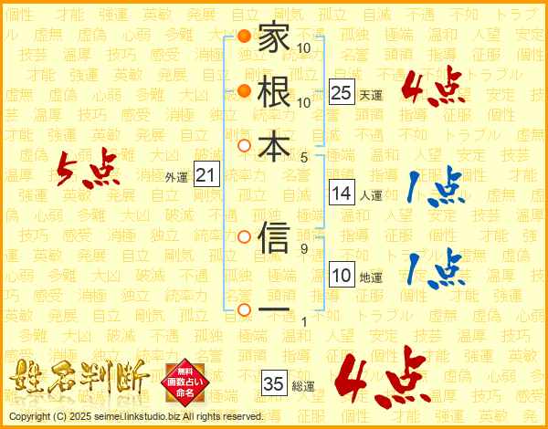 家(10画)根(10画)本(5画) 信(9画)一(1画)