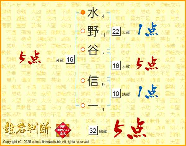水(4画)野(11画)谷(7画) 信(9画)一(1画)