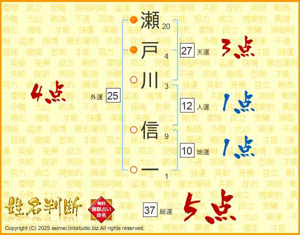 瀬(20画)戸(4画)川(3画) 信(9画)一(1画)