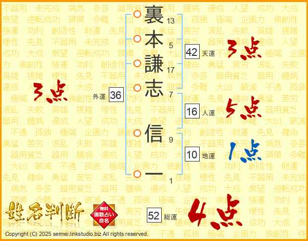 裏(13画)本(5画)謙(17画)志(7画) 信(9画)一(1画)