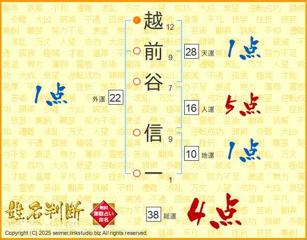 越(12画)前(9画)谷(7画) 信(9画)一(1画)