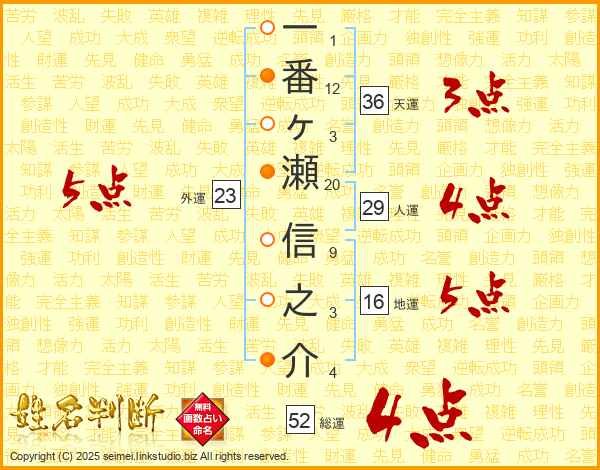 一番ヶ瀬信之介さんの総運は52画の4点!