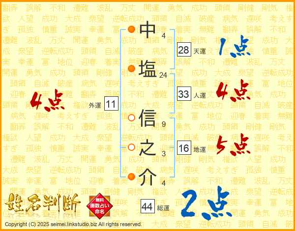中(4画)塩(24画) 信(9画)之(3画)介(4画)