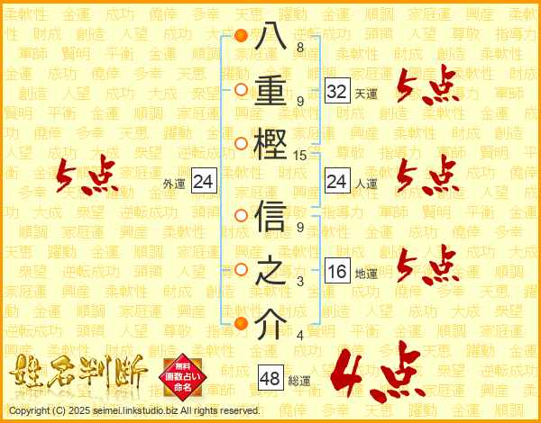 八(8画)重(9画)樫(15画) 信(9画)之(3画)介(4画)