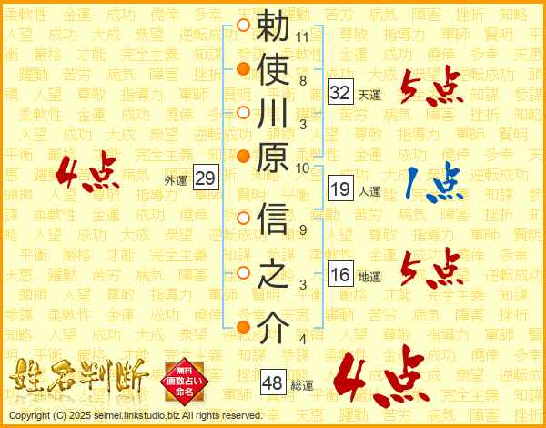 勅(11画)使(8画)川(3画)原(10画) 信(9画)之(3画)介(4画)