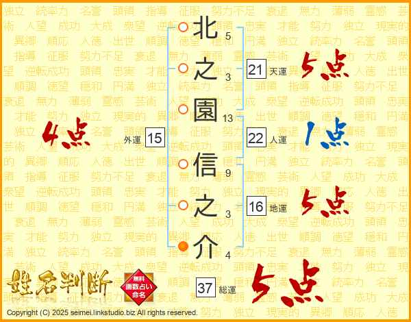 北(5画)之(3画)園(13画) 信(9画)之(3画)介(4画)