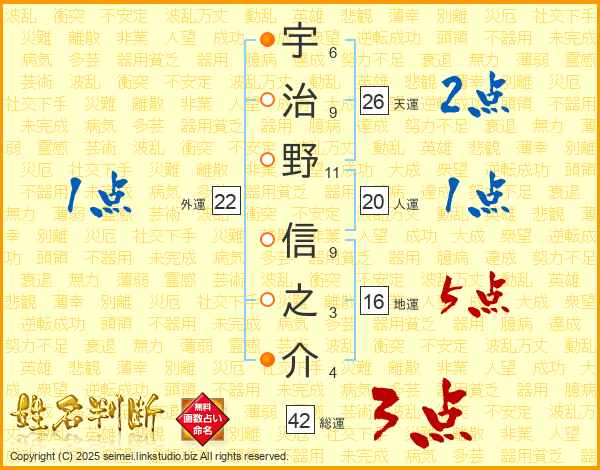宇(6画)治(9画)野(11画) 信(9画)之(3画)介(4画)