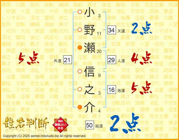 小(3画)野(11画)瀬(20画) 信(9画)之(3画)介(4画)