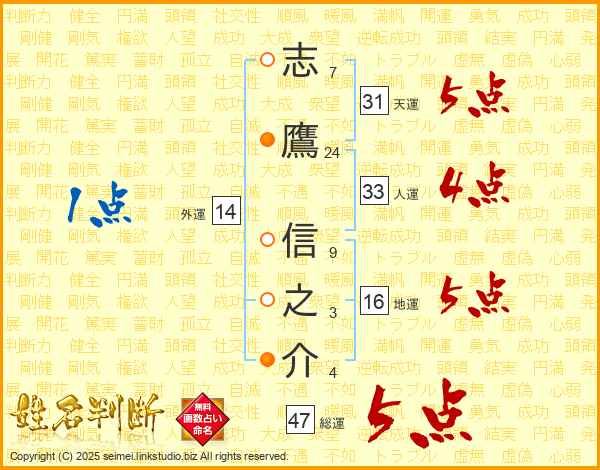 志(7画)鷹(24画) 信(9画)之(3画)介(4画)