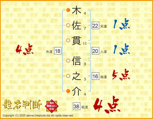 木(4画)佐(7画)貫(11画) 信(9画)之(3画)介(4画)