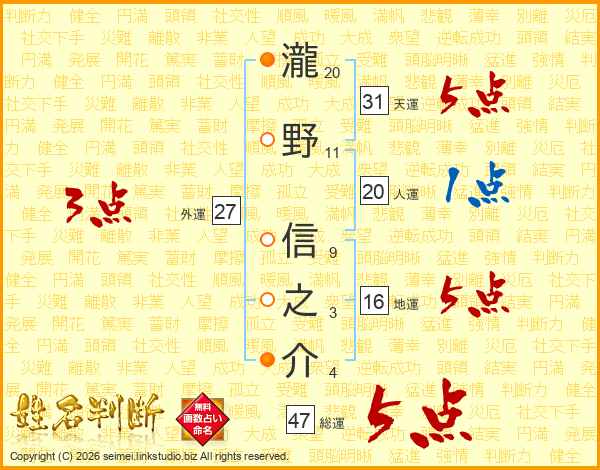 瀧野信之介さんの総運は47画の5点!