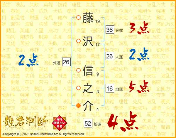 藤(19画)沢(17画) 信(9画)之(3画)介(4画)