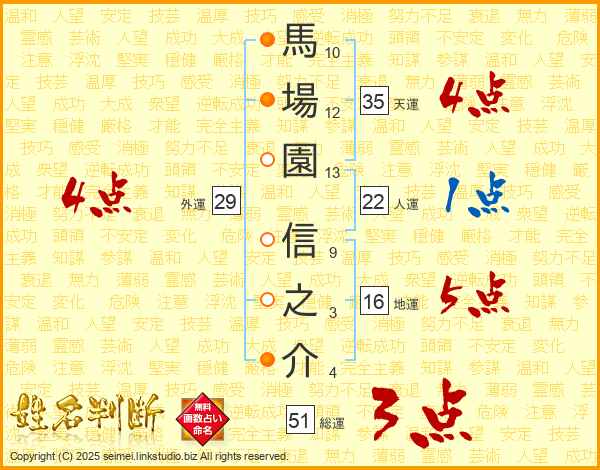 馬(10画)場(12画)園(13画) 信(9画)之(3画)介(4画)
