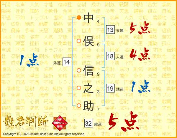 中(4画)俣(9画) 信(9画)之(3画)助(7画)