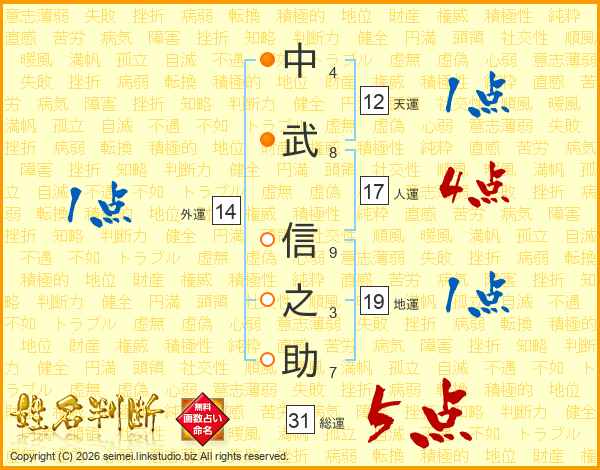 中(4画)武(8画) 信(9画)之(3画)助(7画)