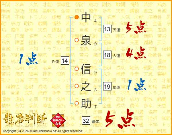中(4画)泉(9画) 信(9画)之(3画)助(7画)