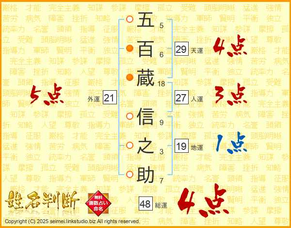 五(5画)百(6画)蔵(18画) 信(9画)之(3画)助(7画)