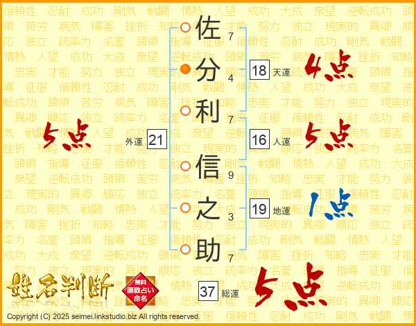 佐(7画)分(4画)利(7画) 信(9画)之(3画)助(7画)