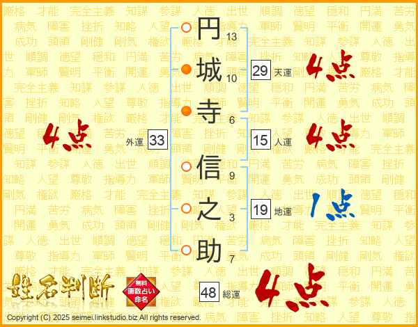 円(13画)城(10画)寺(6画) 信(9画)之(3画)助(7画)