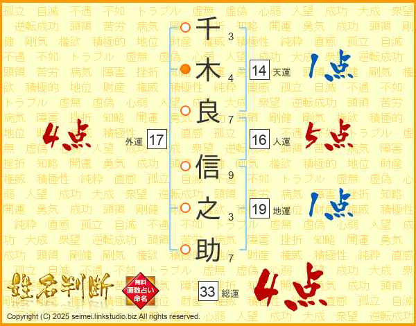 千(3画)木(4画)良(7画) 信(9画)之(3画)助(7画)