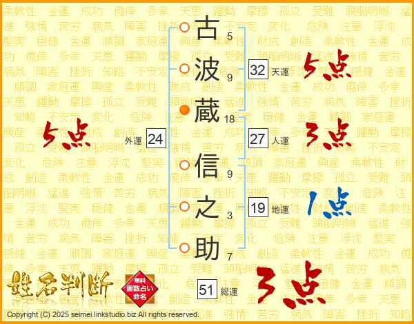 古(5画)波(9画)蔵(18画) 信(9画)之(3画)助(7画)