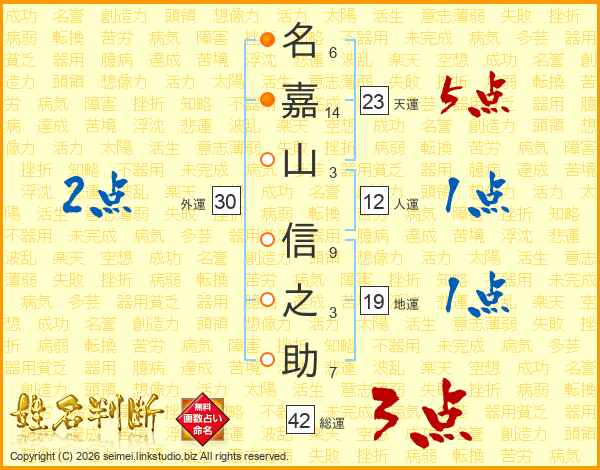 名(6画)嘉(14画)山(3画) 信(9画)之(3画)助(7画)
