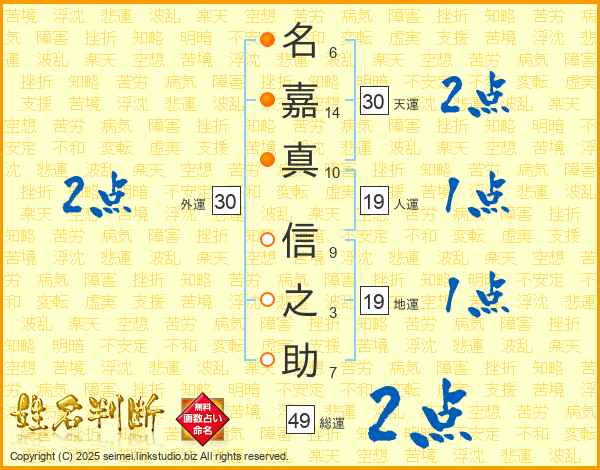名(6画)嘉(14画)真(10画) 信(9画)之(3画)助(7画)